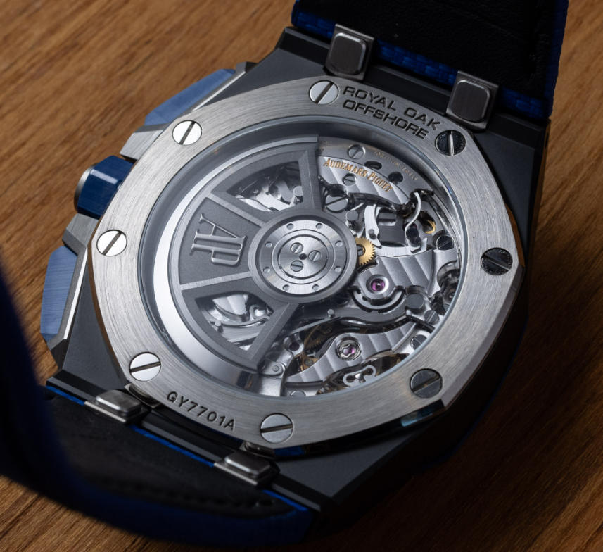 Compared to best clone Audemars Piguet Royal Oak Offshore watches of the recent past, what best distinguishes the new generation of Royal Oak Offshore 43mm wide watches is the novel in-houseAudemars Piguet 4400 series automatic movement. While Audemars Piguet has already introduced modern mechanical movements in most of its core collection models, many timepiece enthusiasts still recall when the otherwise lovely Royal Oak and Royal Oak Offshore models continued to use more legacy, less prestigious movements (even if they were finished beautifully). When you turn the watch over, you can admire the in-house caliber 4401 automatic movement. With very impressive decoration and style, the movement operates at 4Hz with about 70 hours of power reserve and is comprised of 381 parts. The movement features the time with subsidiary seconds, the date, and a flyback 12-hour chronograph.