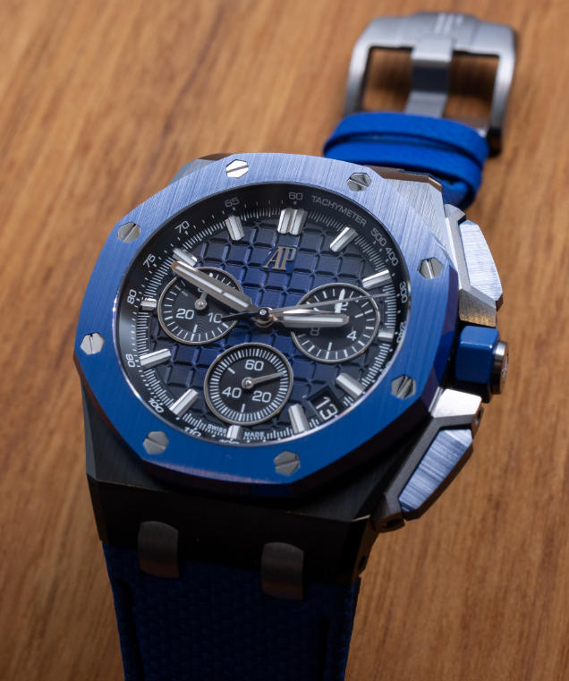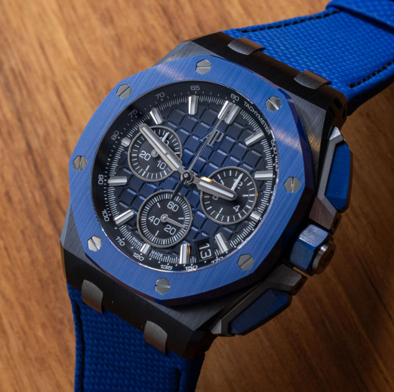The color scheme is moody but attractive and also trendy given that watches like the Rolex GMT-Master II “Batman” offer a similar color palette. The blue and black theme continues on the dial with a deep blue mega tapisserie dial texture as well as the silver rings around the recessed black subdials. Dial legibility is high thanks to the large hands and easy-to-see hour markers. Audemars Piguet has done a nice job of simultaneously modernizing the perfect fake Audemars Piguet Royal Oak Offshore watches dial and keeping it instrumental and luxurious. A tough task, indeed.
