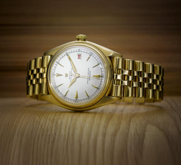 The next major references, 5030 and 5031, were transitional models that introduced some new elements, but remained true to the early ref. 4467 aesthetic. They continued with the “Ovettone” nickname as the Big Bubbleback case back and domed crystal persisted, but a new Rolesor design (gold and steel combo) and all steel option brought a more casual vibe and distinctive look that would really define later models. Ref. 5030 introduced a smooth bezel, while ref. 5031 had an engine turned bezel, but they were otherwise the same. White and black dials were standard and the roulette date wheels were mostly used, and cases were available with yellow or rose gold, two-tone Rolesor and steel. Interestingly, there were three distinctive coronets seen in these references – basically short or tall. As mentioned, these were the first models to have Datejust appear in limited numbers.