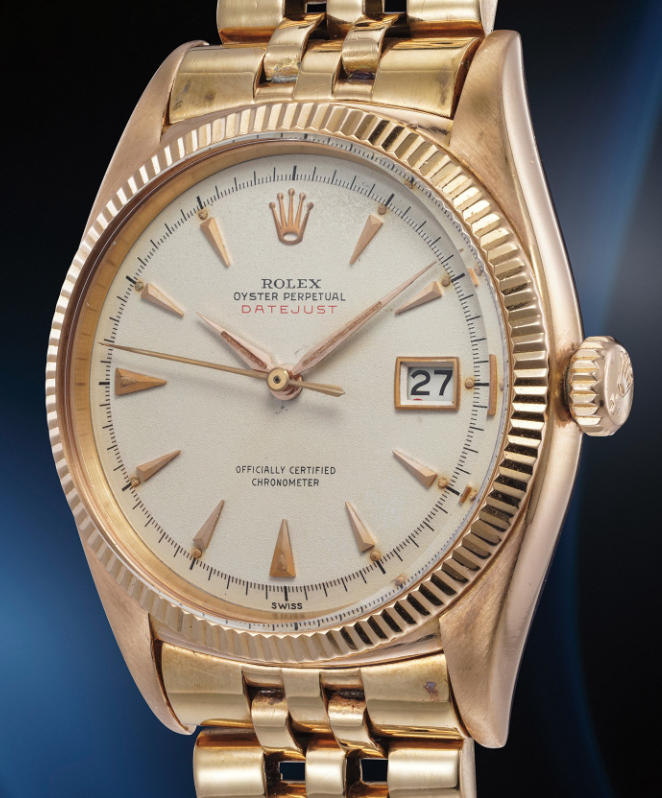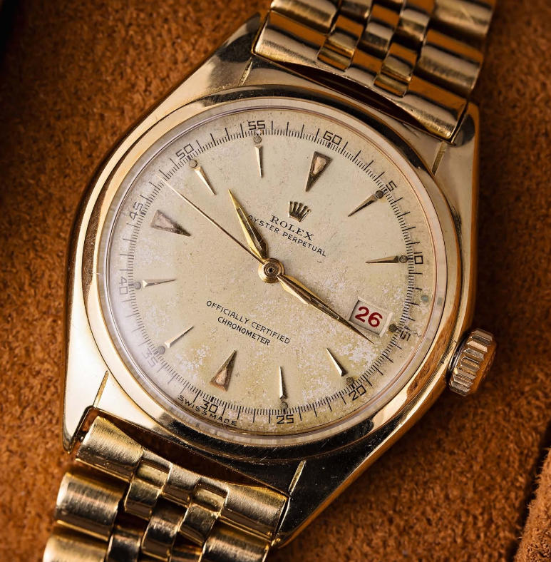 The Datejust again marked the 40th anniversary of Rolex with a 36mm, 18k yellow gold Oyster case, coin-edge fluted bezel and date window at 3 o’clock (without cyclops lens). It also introduced the five-piece Jubilee bracelet (as the word jubilee represents a special anniversary), and although not in its final form, the Datejust formula took the industry by storm as it was the first automatic wristwatch with a date window that automatically changed. The relatively large calibre 710 necessitated a domed or “Big Bubbleback” case back, which was larger and more bulbous than the common Bubbleback Rolex models at the time. It even earned the nickname “Ovettone” (Italian for big egg) as the case back with a domed crystal kind of resembled an egg, at least to some. The off-white dial featured applied gold pointed dagger indices with radium dots and gold alpha hands with radium inserts (safer tritium wasn’t a thing yet). A detailed minute/seconds track with Arabic numerals spanned the outermost perimeter and the bevelled date window sat at 3 o’clock with black print – a position that became a general industry standard moving forward. “Datejust” wasn’t printed on the dial, as “Chronometre” appeared above 6 o’clock instead, while Rolex and Oyster Perpetual were printed below 12 o’clock with a printed coronet. It would be nine years before the first “Datejust” dials debuted around 1954 with ref. 6105, but Datejust still described the 1:1 clone Rolex watches in advertisements and catalogues. That said, a relative handful of dials starting around 1950 with ref. 5030/5031 had Datejust, but it was far from the norm. Later ref. 4467 dials had “Certified Chronometer” above 6 o’clock.