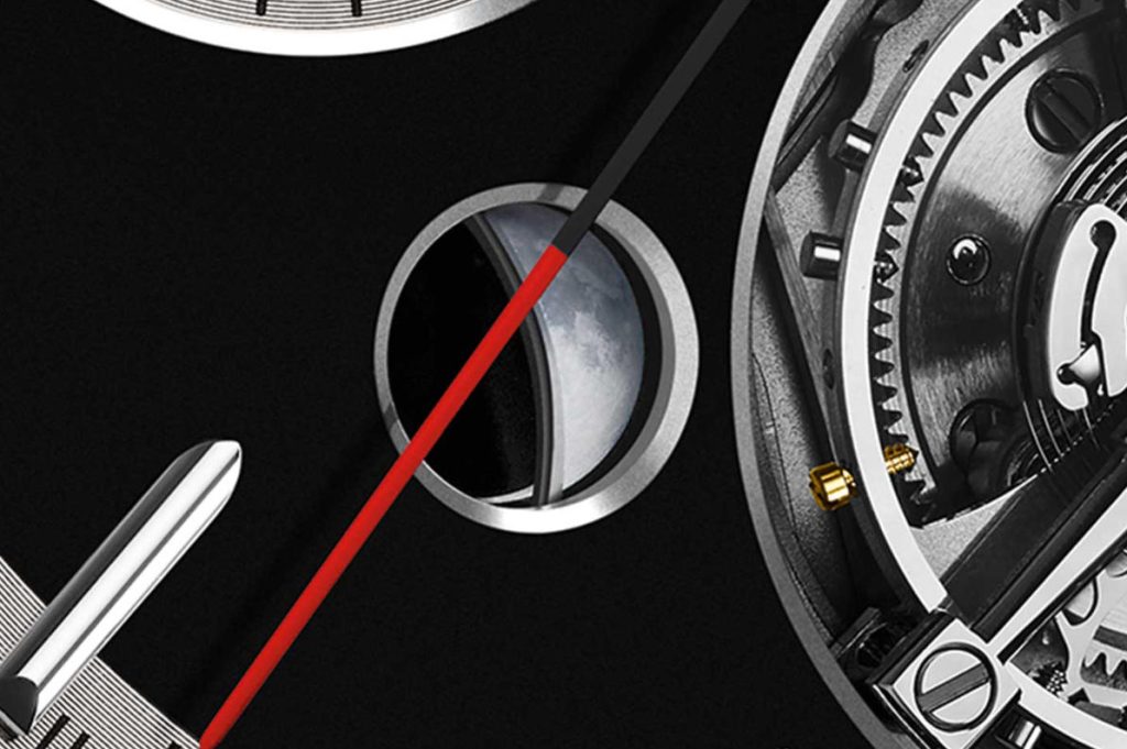 The moonphase is also ingeniously compact yet realistic. It employs two concentric disks with six printed positions each, generating 10 transitional stages in the lunar cycle. More significantly, the two disks reproduce with greater fidelity the shifting shape of the terminator, the boundary between the illuminated and shadowed portions of the Moon. The result is a representation that is not only mechanically efficient but visually closer to the astronomical phenomenon it depicts. Adjustment is equally advanced. The moonphase and day are set by caseband pushers, while date and month can be adjusted bidirectionally by the crowns without risk of damage.